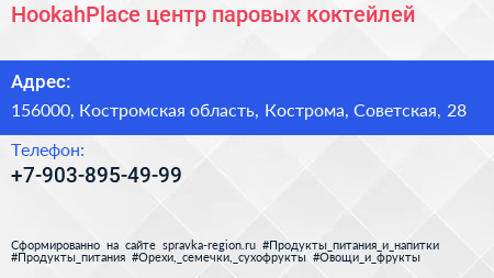 HookahPlace, центр паровых коктейлей по адресу 156000, Костромская область, Кострома, Советская, 28 в дальнейшем Организация, размещена в следующих категориях: