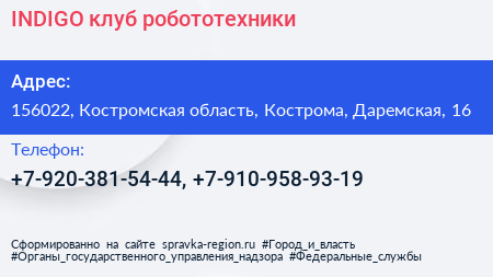 INDIGO, клуб робототехники по адресу 156022, Костромская область, Кострома, Даремская, 16 в дальнейшем Организация, размещена в следующих категориях: