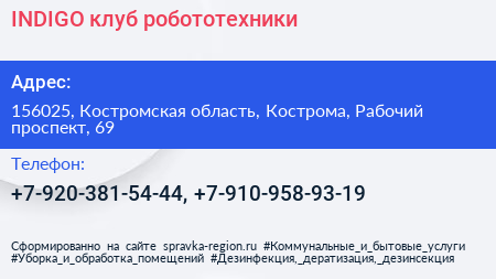 INDIGO, клуб робототехники по адресу 156025, Костромская область, Кострома, Рабочий проспект, 69 в дальнейшем Организация, размещена в следующих категориях:
