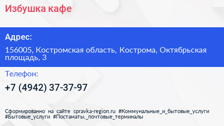 Избушка, кафе по адресу 156005, Костромская область, Кострома, Октябрьская площадь, 3 в дальнейшем Организация, размещена в следующих категориях: