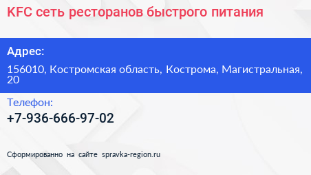 KFC, сеть ресторанов быстрого питания по адресу 156010, Костромская область, Кострома, Магистральная, 20 в дальнейшем Организация, размещена в следующих категориях: