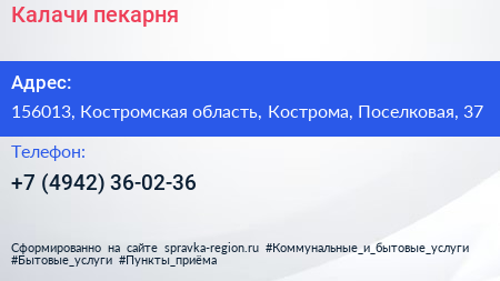 Калачи, пекарня по адресу 156013, Костромская область, Кострома, Поселковая, 37 в дальнейшем Организация, размещена в следующих категориях: