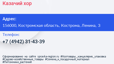 Казачий, хор по адресу 156000, Костромская область, Кострома, Ленина, 3 в дальнейшем Организация, размещена в следующих категориях: