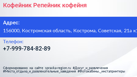 Кофейник Репейник, кофейня по адресу 156000, Костромская область, Кострома, Советская, 21а к1 в дальнейшем Организация, размещена в следующих категориях: