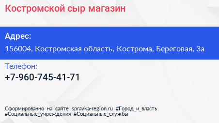 Костромской сыр, магазин по адресу 156004, Костромская область, Кострома, Береговая, 3а в дальнейшем Организация, размещена в следующих категориях: