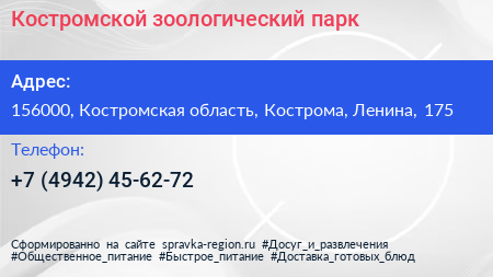 Костромской зоологический парк по адресу 156000, Костромская область, Кострома, Ленина, 175 в дальнейшем Организация, размещена в следующих категориях: