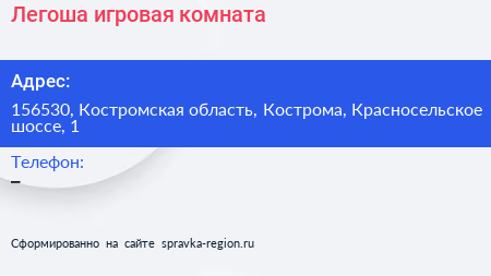 Легоша, игровая комната по адресу 156530, Костромская область, Кострома, Красносельское шоссе, 1 в дальнейшем Организация, размещена в следующих категориях: