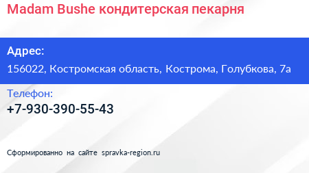 Madam Bushe, кондитерская-пекарня по адресу 156022, Костромская область, Кострома, Голубкова, 7а в дальнейшем Организация, размещена в следующих категориях: