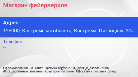 Магазин фейерверков по адресу 156000, Костромская область, Кострома, Пятницкая, 30а в дальнейшем Организация, размещена в следующих категориях: