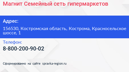 Магнит Семейный, сеть гипермаркетов по адресу 156530, Костромская область, Кострома, Красносельское шоссе, 1 в дальнейшем Организация, размещена в следующих категориях: