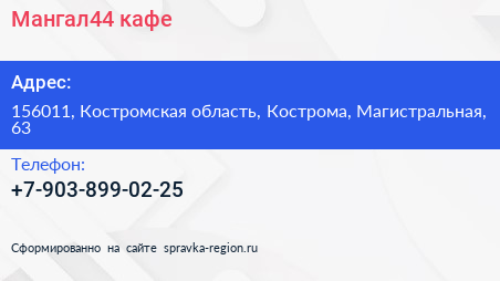 Мангал44, кафе по адресу 156011, Костромская область, Кострома, Магистральная, 63 в дальнейшем Организация, размещена в следующих категориях: