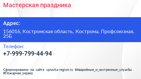 Мастерская праздника по адресу 156016, Костромская область, Кострома, Профсоюзная, 25Б в дальнейшем Организация, размещена в следующих категориях: