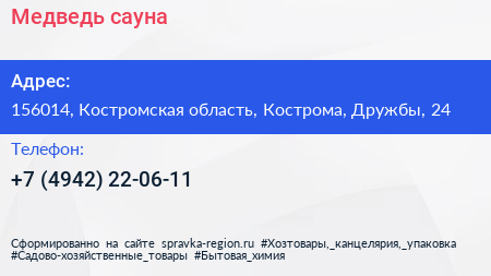 Медведь, сауна по адресу 156014, Костромская область, Кострома, Дружбы, 24 в дальнейшем Организация, размещена в следующих категориях: