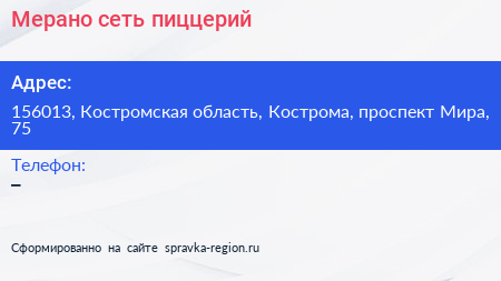 Мерано, сеть пиццерий по адресу 156013, Костромская область, Кострома, проспект Мира, 75 в дальнейшем Организация, размещена в следующих категориях: