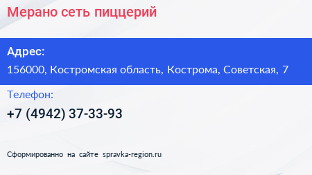 Мерано, сеть пиццерий по адресу 156000, Костромская область, Кострома, Советская, 7 в дальнейшем Организация, размещена в следующих категориях: