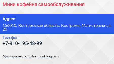 Мини-кофейня самообслуживания по адресу 156010, Костромская область, Кострома, Магистральная, 20 в дальнейшем Организация, размещена в следующих категориях: