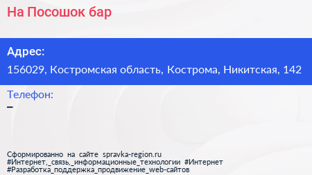 На Посошок, бар по адресу 156029, Костромская область, Кострома, Никитская, 142 в дальнейшем Организация, размещена в следующих категориях: