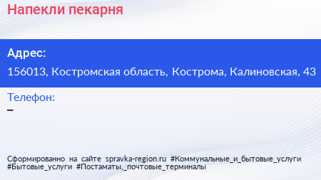 Напекли, пекарня по адресу 156013, Костромская область, Кострома, Калиновская, 43 в дальнейшем Организация, размещена в следующих категориях: