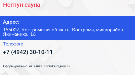 Нептун, сауна по адресу 156007, Костромская область, Кострома, микрорайон Якиманиха, 16 в дальнейшем Организация, размещена в следующих категориях: