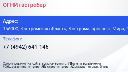 ОГНИ, гастробар по адресу 156000, Костромская область, Кострома, проспект Мира, 4 в дальнейшем Организация, размещена в следующих категориях: