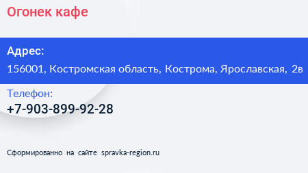 Огонек, кафе по адресу 156001, Костромская область, Кострома, Ярославская, 2в в дальнейшем Организация, размещена в следующих категориях:
