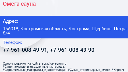 Омега, сауна по адресу 156019, Костромская область, Кострома, Щербины Петра, 8/4 в дальнейшем Организация, размещена в следующих категориях: