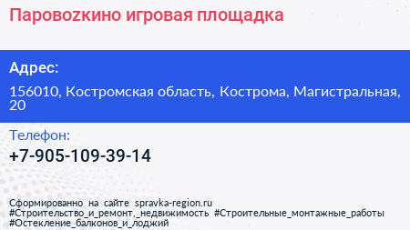 Паровоzкино, игровая площадка по адресу 156010, Костромская область, Кострома, Магистральная, 20 в дальнейшем Организация, размещена в следующих категориях: