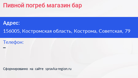 Пивной погреб, магазин-бар по адресу 156005, Костромская область, Кострома, Советская, 79 в дальнейшем Организация, размещена в следующих категориях:
