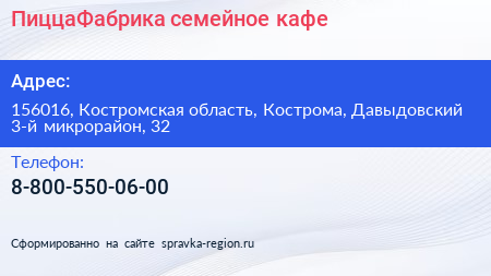ПиццаФабрика, семейное кафе по адресу 156016, Костромская область, Кострома, Давыдовский 3-й микрорайон, 32 в дальнейшем Организация, размещена в следующих категориях: