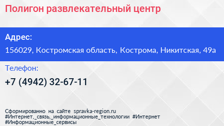 Полигон, развлекательный центр по адресу 156029, Костромская область, Кострома, Никитская, 49а в дальнейшем Организация, размещена в следующих категориях: