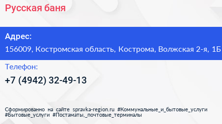 Русская баня по адресу 156009, Костромская область, Кострома, Волжская 2-я, 1Б в дальнейшем Организация, размещена в следующих категориях: