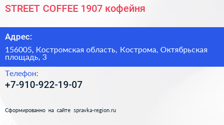 STREET COFFEE 1907, кофейня по адресу 156005, Костромская область, Кострома, Октябрьская площадь, 3 в дальнейшем Организация, размещена в следующих категориях: