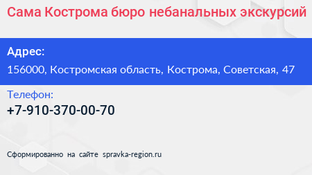 Сама Кострома, бюро небанальных экскурсий по адресу 156000, Костромская область, Кострома, Советская, 47 в дальнейшем Организация, размещена в следующих категориях: