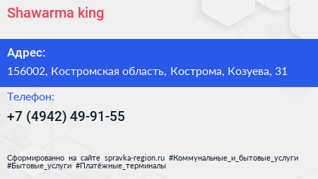 Shawarma king по адресу 156002, Костромская область, Кострома, Козуева, 31 в дальнейшем Организация, размещена в следующих категориях:
