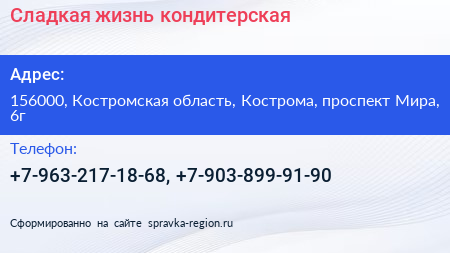 Сладкая жизнь, кондитерская по адресу 156000, Костромская область, Кострома, проспект Мира, 6г в дальнейшем Организация, размещена в следующих категориях: