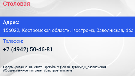 Столовая по адресу 156022, Костромская область, Кострома, Заволжская, 16а в дальнейшем Организация, размещена в следующих категориях: