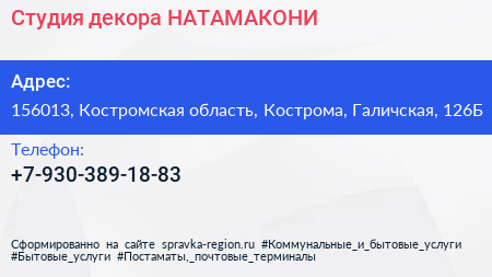 Студия декора НАТАМАКОНИ по адресу 156013, Костромская область, Кострома, Галичская, 126Б в дальнейшем Организация, размещена в следующих категориях: