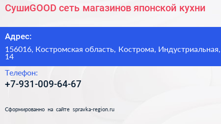 СушиGOOD, сеть магазинов японской кухни по адресу 156016, Костромская область, Кострома, Индустриальная, 14 в дальнейшем Организация, размещена в следующих категориях: