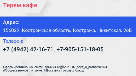 Терем, кафе по адресу 156029, Костромская область, Кострома, Никитская, 96Б в дальнейшем Организация, размещена в следующих категориях: