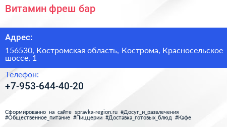 Витамин, фреш-бар по адресу 156530, Костромская область, Кострома, Красносельское шоссе, 1 в дальнейшем Организация, размещена в следующих категориях: