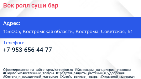Вок-ролл, суши-бар по адресу 156005, Костромская область, Кострома, Советская, 61 в дальнейшем Организация, размещена в следующих категориях: