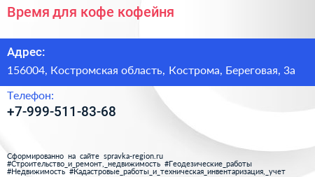 Время для кофе, кофейня по адресу 156004, Костромская область, Кострома, Береговая, 3а в дальнейшем Организация, размещена в следующих категориях: