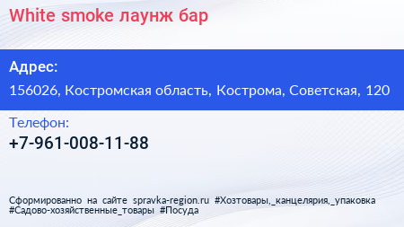 White smoke, лаунж-бар по адресу 156026, Костромская область, Кострома, Советская, 120 в дальнейшем Организация, размещена в следующих категориях: