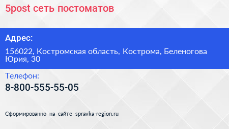 5post, сеть постоматов по адресу 156022, Костромская область, Кострома, Беленогова Юрия, 30 в дальнейшем Организация, размещена в следующих категориях:
