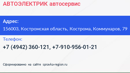 АВТОЭЛЕКТРИК, автосервис по адресу 156003, Костромская область, Кострома, Коммунаров, 79 в дальнейшем Организация, размещена в следующих категориях: