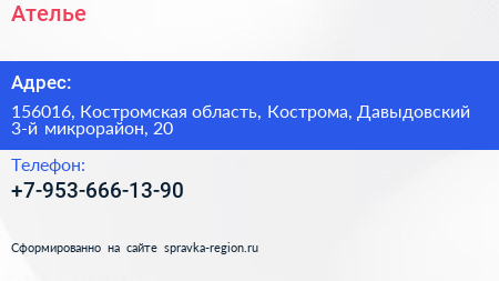 Ателье по адресу 156016, Костромская область, Кострома, Давыдовский 3-й микрорайон, 20 в дальнейшем Организация, размещена в следующих категориях: