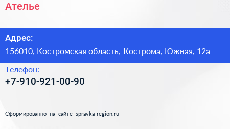 Ателье по адресу 156010, Костромская область, Кострома, Южная, 12а в дальнейшем Организация, размещена в следующих категориях: