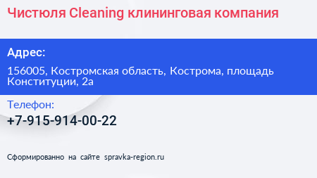Чистюля Cleaning, клининговая компания по адресу 156005, Костромская область, Кострома, площадь Конституции, 2а в дальнейшем Организация, размещена в следующих категориях: