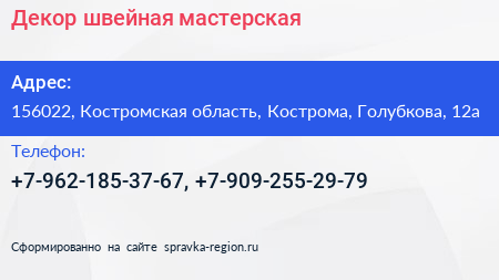 Декор, швейная мастерская по адресу 156022, Костромская область, Кострома, Голубкова, 12а в дальнейшем Организация, размещена в следующих категориях:
