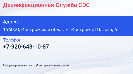 Дезинфекционная Служба СЭС по адресу 156000, Костромская область, Кострома, Шагова, 6 в дальнейшем Организация, размещена в следующих категориях: